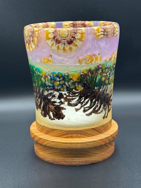 A handcrafted vase made of pine cones, corn, epoxy and zebra wood featuring premium materials and artisan quality. Size: 12" tall, 5" wide. Perfect as a decorative accent, handmade gift, or centerpiece.